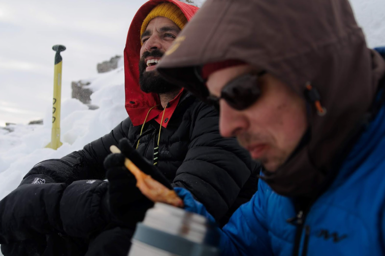 Ei se sauvan rikkoontuminen mihinkään vaikuttanut. Simppa ja Anton painoivat kärjessä ja itse puuskuttelin perässä. Pääsin kuitenkin kaksikon perässä huipulle, jossa vallitsi olosuhteet kuin Mordorissa - tuuli niin penteleesti. Siinä ei auttanut kuin mennä kiven taakse suojaan nauttimaan eväitä ja miettimään mistä suunnata alas. Mietinnät osoittautuivat melko turhiksi, sillä lumi oli haastavaa joka paikassa ja näkyvyys oli huono. Tauolta saatiin sentään iloisia kuvia, kun Simo yritti kauhoa ruokaa ostamastaan "ruoka"termarista ainoalla tarpeeksi pitkällä välineellä, eli puukauhalla.